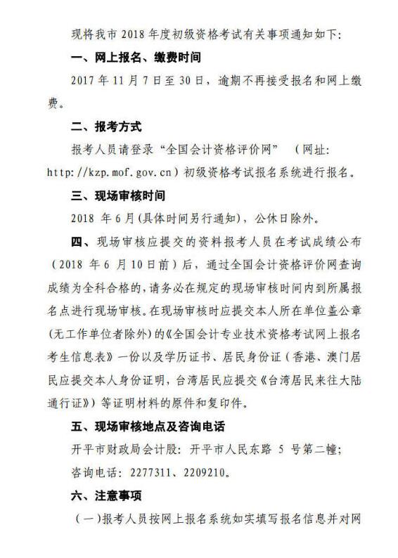 2018年開平市初級會計師報名時間11月7日至30日;全省統(tǒng)一采用全國會計資格評價網報名。