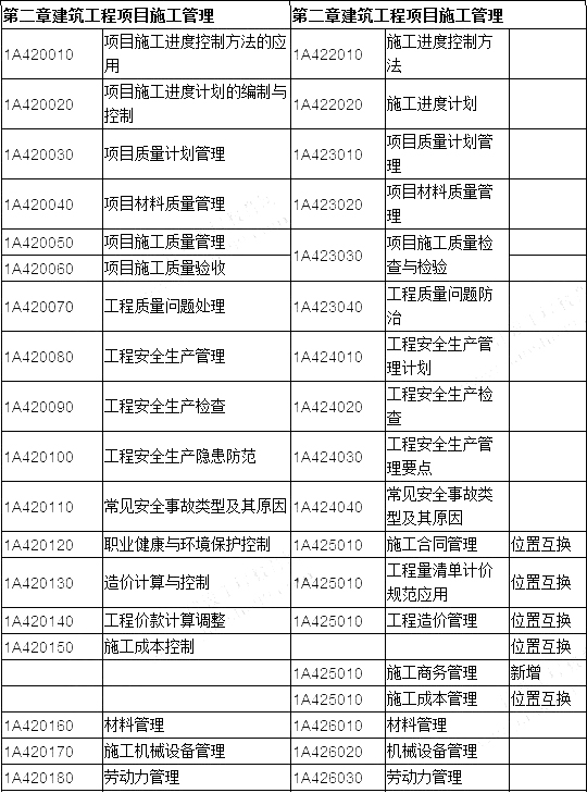 1.刪除“施工招標(biāo)投標(biāo)管理”“項目管理規(guī)劃”“項目綜合管理控制”三節(jié),新增“技術(shù)應(yīng)用管理”“施工商務(wù)管理”和“建筑工程驗收管理”三節(jié),其他小節(jié)位置有調(diào)整。