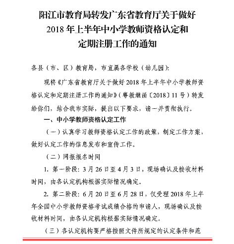 陽江市2018年上半年教師資格認(rèn)定和定期注冊工作通知