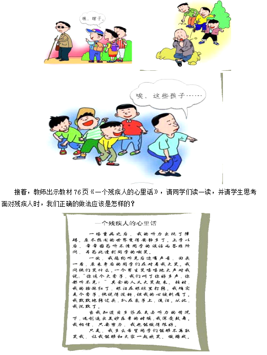 教師通過(guò)課件展示教材76頁(yè)圖片,請(qǐng)同學(xué)們分小組,選出組員做圖中的殘疾人,其他組員做殘疾人的家人,請(qǐng)同學(xué)們根據(jù)圖畫(huà)內(nèi)容扮演角色。學(xué)生表演之后,請(qǐng)扮演殘疾人的同學(xué)說(shuō)一說(shuō)他們被嘲笑、被欺負(fù)時(shí)的心情;請(qǐng)扮演殘疾人家人的同學(xué)說(shuō)一說(shuō)他們的感受。