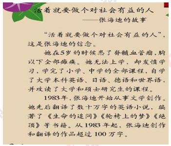 教師向同學(xué)們講述教材75頁(yè)張海迪的事跡,并請(qǐng)學(xué)生說(shuō)一說(shuō)聽(tīng)完她的事跡之后,你有什么樣的感受。學(xué)生發(fā)言之后,教師根據(jù)學(xué)生的回答引導(dǎo)學(xué)生了解,張海迪之所以在身體殘疾的情況下還能取得如此巨大的成功,那是因?yàn)樗任覀冋H烁冻隽烁嗟呐?,是值得我們敬佩和學(xué)習(xí)的。