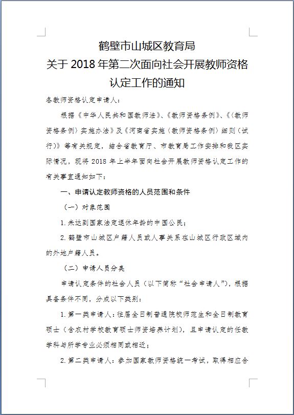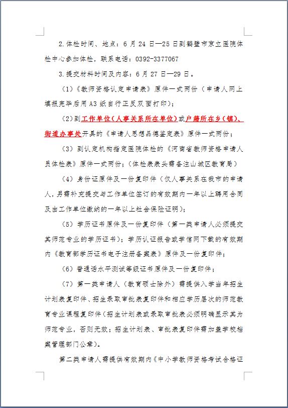 摘要:鶴壁市山城區2018年第二次教師資格認定網上申報時間6月13-19日;體檢時間6月24-25日,體檢醫院為鶴壁市京立醫院體檢中心。提交材料時間6月27-29日。