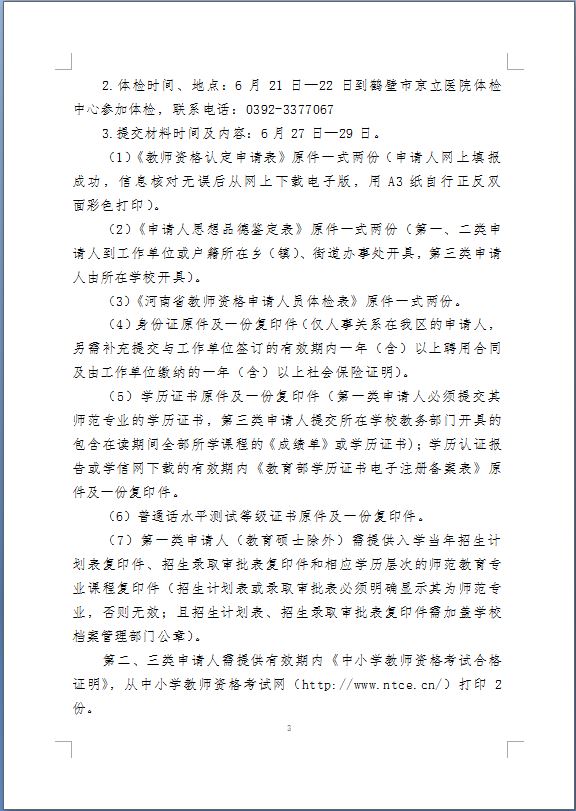 摘要:2018第二次鶴壁市淇濱區教師資格認定網上申報時間6月13-19日;體檢時間6月21-22日,體檢醫院為鶴壁市京立醫院體檢中心;提交材料時間6月27-29日。