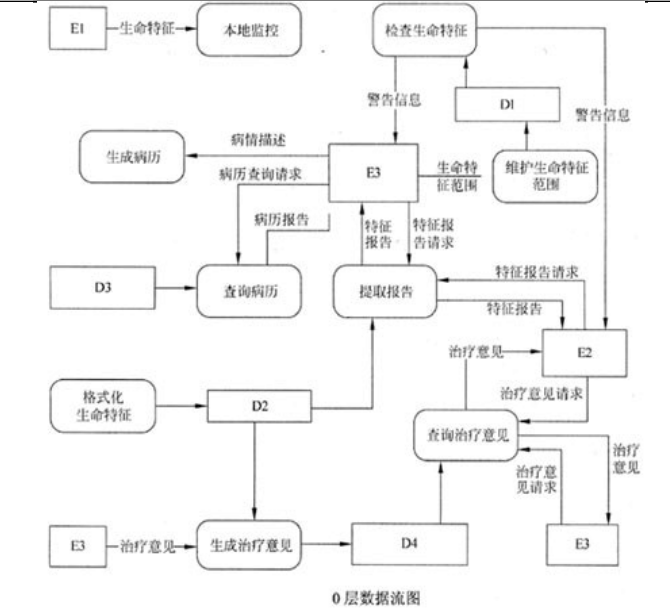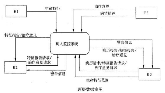 現采用結構化方法對病人監控系統進行分析與設計,獲得如圖1—1所示的項層數據流圖和圖1-2所示的0層數據流圖。