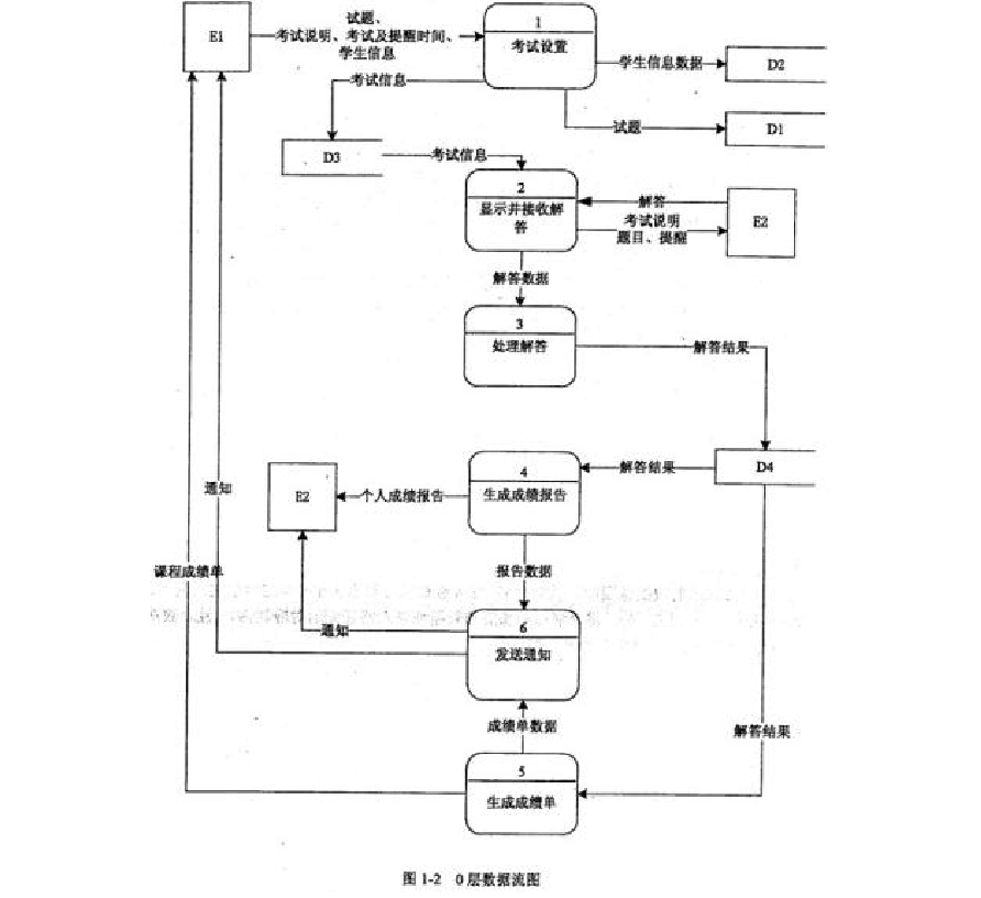 現采用結構化方法對考試系統進行分析與設計,獲得如圖1-1所示的上下文數據流圖和圖1-2所示的0層數據流圖。