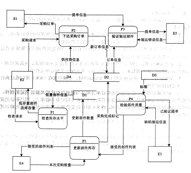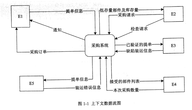 現(xiàn)采用結(jié)構(gòu)化方法對該采購系統(tǒng)進行分析與設(shè)計,獲得如圖1-1所示的上下文數(shù)據(jù)流圖和圖1-2所示的0層數(shù)據(jù)流圖。