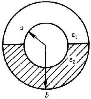 一個同心球電容器的內導體的半徑為a,外導體的內半徑為c,其間填充兩種漏電介質,