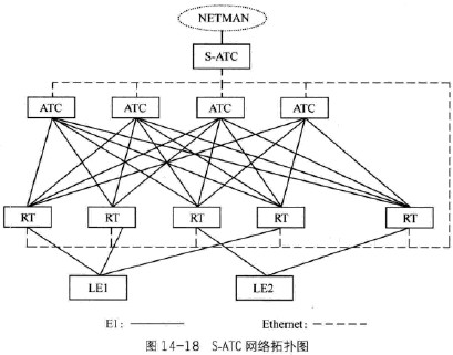 在比較大的PAS系統(tǒng)中,除考慮話務量因素外和提供PAS系統(tǒng)的一些附加業(yè)務(如MissedCall,SMS,Location等),有利于提高系統(tǒng)的處理能力和速度,目前還發(fā)展成一種基于服務器結(jié)構的所謂S-ATC,它是采用路由和集中式數(shù)據(jù)庫、分布形態(tài)的漫游處理方式,其中每RT均以兩個或兩個以上的路由接入不同的ATC,并以動態(tài)話務分配進入到不同的ATC,來保證話務的疏通和消息的傳送,因此是一個無阻塞的網(wǎng)絡結(jié)構,同時采用大型數(shù)據(jù)庫結(jié)構來保證用戶認證數(shù)據(jù)的有效到達和快速處理。因此在性能和服務方式上將得到有效的改善。一個PAS系統(tǒng)是否采用ATC或S-ATC結(jié)構主要取決于系統(tǒng)規(guī)模的大小和是否需要提供諸如PS定位跟蹤服務、透明的32kbit/s以上(包括32kbit/s)數(shù)據(jù)到數(shù)據(jù)的通信、SMS短信服務等。S-ATC網(wǎng)絡拓撲結(jié)構如圖14-18所示。