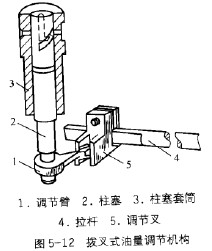 柱塞在套簡中的轉動是靠油量調節機構完成的。油量調節機構有撥叉式和齒條式兩種。撥叉式油ft調節機構如圖5-12所示,由拉桿、調節臂、調節叉等組成。調節叉(每個分泵有一個)用螺釘固定在拉桿上,油量調節臂球頭插入調節叉槽中。拉桿左右移動時,各分泵的柱塞同時跟著轉動,從而改變供油依。柴油機工作時,拉桿的動作由調速器Cl動控制。抒松調節叉的固定螺絲,在拉桿上個別移動調節叉,可以調整各氣缸供油厘及供油的均勻性。此外,在拉桿上壓有停泊銷子,停油時拉動手柄撥動銷子,便可使拉桿移向停止供油位符。
