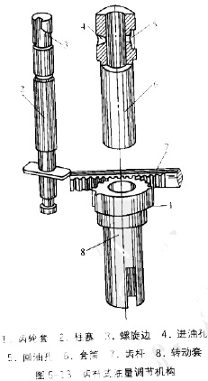 供油贄調節是通過柱塞在柱塞套筒中的轉動來實現的。螺旋斜面與回油孔的相對位置改變時,螺旋斜血邊緣打開回油孔的時間改變,因而供油量得到了調節。
