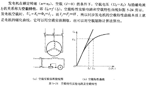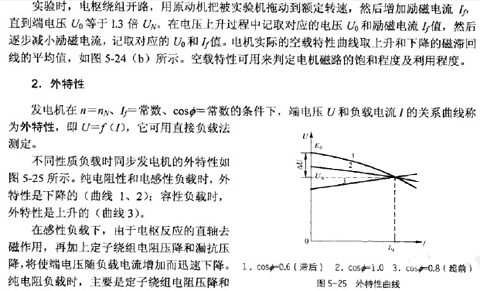 在電阻性和感性負(fù)載時(shí),為了補(bǔ)償負(fù)栽電流產(chǎn)生的電壓降,保持端電壓+變,勵(lì)磁電流必須隨負(fù)戰(zhàn)電流增大而增大,因此這兩種情況下的調(diào)整特性曲線都足上升的。功率W數(shù)越低,調(diào)整特性曲線上升得越快。容性負(fù)載時(shí)。調(diào)整特性曲線是下降的,如圖5-26所示。