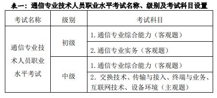 通信專業技術人員職業水平考試考試級別、科目設置見表一。
