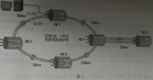 圖1所示SDH環形網中,NE1~NE4一般配置的網元類型為( ),二纖雙向復用段保護環業務量的保護是以( )為基礎的,采用( )技術使S1光纖和P2光纖上的信號置于一根光纖(同時使S2光纖和P1光纖上的信號置于一根光纖,若某一段光纜被切斷,節點開關倒換時需要遵循的協議為( );NE4和NE5之間若需要保護倒換,應該采用的保護方式為( )