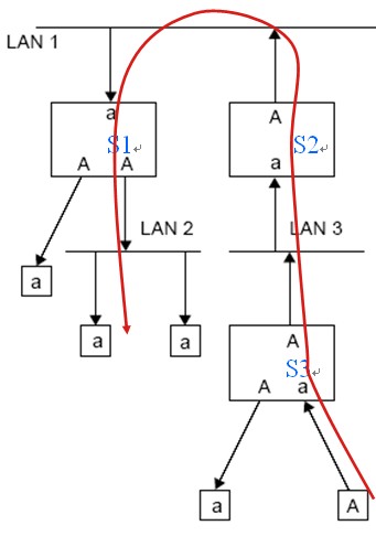 如圖28,屬性A通過GARP協(xié)議的信息傳遞機制,分別在交換機S1、S2、S3接收到注冊報文的端口進行了注冊(a)。顯然,GARP協(xié)議的屬性注冊和注銷僅僅是對于接收到GARP BPDU的端口而言的。這樣,只有單個屬性源的情況下,屬性注冊形成的都是單向通路。雙向通路只有兩個相同的屬性源注冊后才能形成,確保了與屬性相關(guān)的流量限制在了該雙向鏈路上。減少了網(wǎng)絡(luò)的冗余。