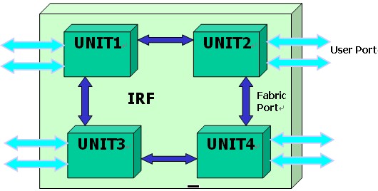 圖35是一個IRF組成示意。IRF中每臺設備稱作一個Unit,多個Unit互聯就組成了一個Fabric.內部互連的端口就稱為Fabric Port,業務端口稱為User Port。