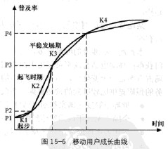 準確把握蜂窩移動通信的發展規律、正確認識蜂窩移動通信所處的發展階段是進行市場需求預測的前提。蜂窩移動電話的發展過程應該符合成長曲線的規律。在其引入初期(起步階段),價格昂貴,絕對數量的增長比較緩慢,但由于基數少,增長率很高,隨著設備成本的降低,這種商品逐步為人們所接受,必然要經歷一個接近指數率增長的飛速發展時期(起飛時期),而后進入平穩發展階段,最終將達到飽和階段。如圖15-6所示。