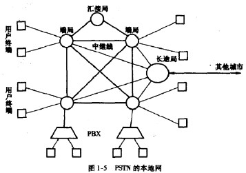 本地網(LocalNetwork)如圖1-5所示。用戶終端(電話機、傳真機或話帶數據終端等)經用戶環路或用戶小交換機接人端局(EndOffice),俗稱市話局。端局內設端局交換機;各端局之間及各端局與長途局之間通過中繼線互連;在某些端局之間可能設匯接局,以提供附加的路由。