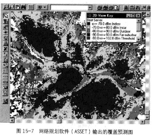 如果在預規(guī)劃中需要給出覆蓋預測圖,可使用Planet,Netplan及ASSET等規(guī)劃工具,選擇合適的電子地圖,確定傳播模型,輸入基站的工程參數,就可以得到基站的覆蓋效果預測圖,如圖15-7所示。它是用網絡規(guī)劃軟件對某地區(qū)GSM系統的覆蓋進行預測的結果,圖中不同顏色代表預測得到的不同接收功率,通過此圖可預測得到網絡在室內外的最佳覆蓋區(qū)域。