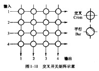 交換網絡(SwitchingFabrics)執行交換機的傳送面功能。從原理上看,最基本的交換網絡是一個交叉接點(Crossbar)矩陣,它提供任意輸人與輸出之間的可控制的連接。圖11示出一個4x4的交叉接點矩陣,每個接點的開關有兩種狀態:交叉連接(Cross)或平行連接(Bar)。如果要使第*'條輸人線與第)條輸出線連通,那么,只要令相應交叉點的開關處于平行連接狀態,而讓這兩條線上的其他開關保持交叉連接狀態即可。當然,實際的交換網絡要復雜得多,它可能是單個的Crossbar交換器或交換單元,也可能是由許多交換單元組成的多級交換網絡。對于分組型的交換網絡,在交換單元的輸人端或輸出端,還可能設有緩沖器。