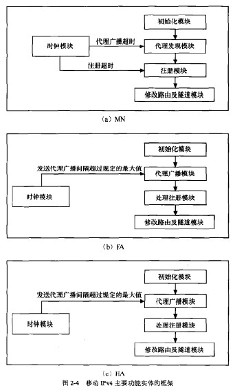 移動IPv4具有代理發現、注冊和數據包選路等功能。移動IPv4協議的主要功能實體包括移動節點(MN)、外地代理(FA)和家鄉代理(HA),這3個功能實體的基本模塊組成如圖2-4所示。