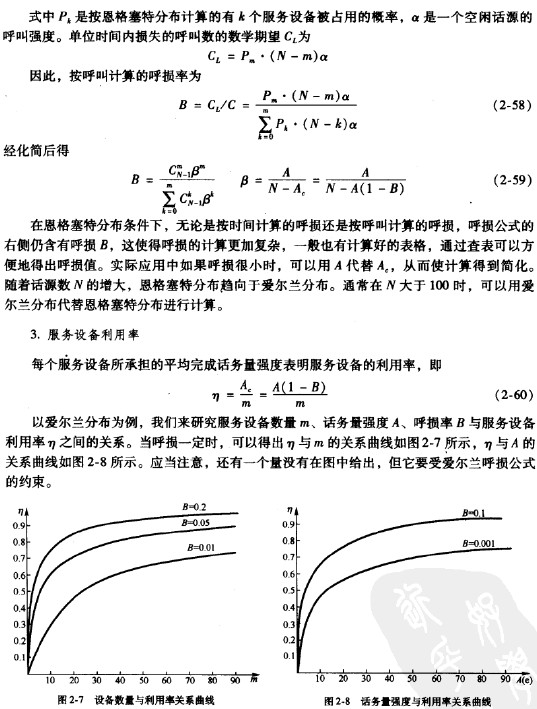 從圖2-7的曲線可以看出,在服務設備數量一定的條件下,呼損越大,服務設備利用率越髙;從圖2-8的曲線可以看出,在流人話務量強度一定的條件下,呼損越大,服務設備的利用率也越高。呼損大意味著服務質量低。因此,用提高呼損率從而降低服務質量的辦法,可以提高設備的利用率。但交換系統的設計,必須兼顧服務質量與經濟效益兩個方面。