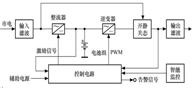 UPS系統由整流器、逆變器、蓄電池組和輸出轉換開關構成,在市電供電時,UPS系統先整流再通過逆變器輸出無干擾的工頻交流電。當市電掉電時,UPS系統由蓄電池通過逆變供電,輸出工頻交流電。