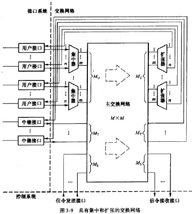 實際應用中的數字交換網絡常具有圖3-9所示的形式,網絡中信息的傳輸是單方向的,每一種接口都需要連接網絡的一條人線和一條出線。由于每臺電話終端產生的話務量較小,用戶接口經集中器和擴張器與主網絡相連。集中器是一個nxm網絡,其中r>m,n/m稱為集中比,常在4:1~16:1之間。擴張器與集中器正好相反。中繼線厲于共享資源,其話務量較大,中繼接口不需要集中,直接與主網絡相連。但中繼線是分方向的,因而常把中繼接口分為群。信令接收接口接收用戶線和中繼線輸人的信令,并轉交控制系統處理。信令發送接口將控制系統產生的信令經交換網絡送至指定的用戶線或中繼線。主網絡通常是一個MxW多級方型網絡,當接口的發送端連接主網絡的第k號人線時,其接收端必定連接主網絡的第號出線,這種方法稱為輸入折疊,它為選線和控制帶來方便。