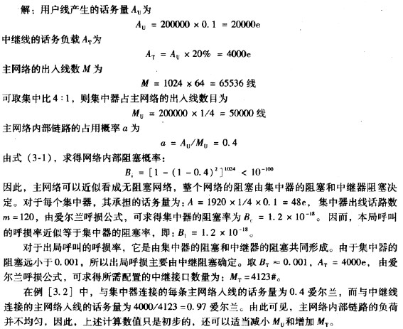 例[3.2]FETEX-150交換機的交換網絡如圖3:10所示,主交換網絡是一個55^三級網絡,第一級和第三級各有64個1024x1024交換器。每個集中器最多可以連接1920個用戶線,集中后輸出線為128條,其中120條為話路,其余8條為信令信道。每個中繼模塊可以連接60條中繼線,輸出線為64條,其中60條為話路,其余4條為信令信道。假設交換機用作市話交換,共安裝了200000門電話,每部電話的話務量為O.le,其中出入局呼叫占20%。中繼線全部連接k同一臺匯接交換機,要求出局呼損率小于0.001。試計算交換機的呼損率和應配置的中繼接口數量。