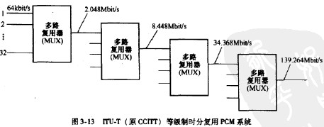 在時(shí)分多路復(fù)用系統(tǒng)中,對(duì)一次群信號(hào)進(jìn)一步實(shí)行多路復(fù)用,可依次得到二、三和四次群。對(duì)于PCM30/32系統(tǒng)來說,其基群速率為2.048Mbit/s,二次群由四個(gè)基群復(fù)用而成,速率為8.448Mbit/s,話路數(shù)為4x30=120。圖3-13給出了HU-T(原CCITT)建議的等級(jí)制時(shí)分復(fù)用PCM系統(tǒng)的組成。表3-1給出了CEPT和BELL系統(tǒng)中各次群的話路數(shù)及相應(yīng)的速率。