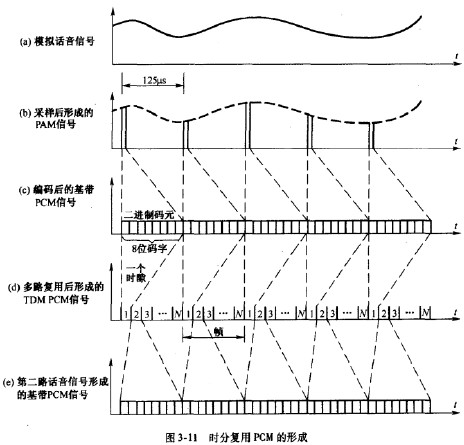 現(xiàn)代電話通信網(wǎng)的核心網(wǎng)已經(jīng)實(shí)現(xiàn)了數(shù)字化,但大量用戶終端(電話機(jī)、傳真機(jī)等)仍為模擬終端,因此,話音信號(hào)要進(jìn)人網(wǎng)絡(luò)進(jìn)行傳輸和交換,必須首先進(jìn)行數(shù)字化。數(shù)字化過程包括采樣、量化和編碼三個(gè)步驟。由于話音信號(hào)的能童主要集中在300HZ-3400HZ范圍內(nèi),根據(jù)奈奎斯特采樣定理,確定話音信號(hào)的采樣頻率為8000Hz(樣點(diǎn)間隔為125微秒),經(jīng)采樣后形成PAM(PulseAmplitudeModulation)信號(hào)。對(duì)每個(gè)樣值依其幅度進(jìn)行量化,并編碼成一個(gè)8位二進(jìn)制碼字,便得到PCM基帶信號(hào)。編碼規(guī)則有A律和u律兩種,A律在歐洲和中國得到普遍采用,律主要在北美和日本流行。為了充分利用信道的帶寬,常在傳輸前對(duì)PCM基帶信號(hào)進(jìn)行多路復(fù)用,形成時(shí)分復(fù)用(TDM)PCM信號(hào)。圖3-11給出了/V路PCM基帶信號(hào)時(shí)分復(fù)用過程的示意圖。