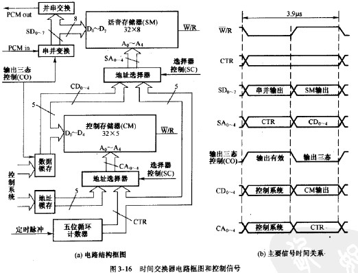 上面討論了時間交換器的組成和工作原理,除了話音存儲器和控制存儲器,時間交換器的組成電路中還包括:串并變換電路、并串變換電路、計數器及其他控制電路。時間交換器中既有組合邏輯電路也有時序電路,圖3-16給出了PCM-次群時間交換器的電路框圖和主要控制信號的時間關系。