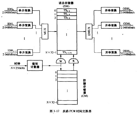 現在來討論多路PCM-次群的時間交換器,它要完成不同PCM一次群信號中各時隙之間的交換。一個能實現A1路PCM交換的時間交換器如圖3-17所示,輸人時分復用線用IDHInputDigitalHighway)表示,即IDHo,IDH,1DHV.10輸出時分復用線用ODH(OutputDigitalHighway)表示,即ODH。,ODH,,…,ODHWM。輸人的況路一次群信號經串并變換及多路復用后,形成8線并行的輸出。如果將1DH,的第)時隙記著TSy,則多路復用后的輸出依次為:TSTSyTSq/TS^TSy。串并變換和復用原理如圖3-18所示。多路交換的時間交換器和單路交換的原理相同,但這里的話音存儲器(SM)的容量為32x8位,控制存儲器(CM)的容量為/Vx32x(log^+5)位,輸人輸出時隙速率為Nx256kHz,循環計數器的位數為5+log2AT。如果話音存儲器按“順序寫入,控制讀出”方式工作.則IDH,時隙的內容寫人到SM的第ATxy+i單元。