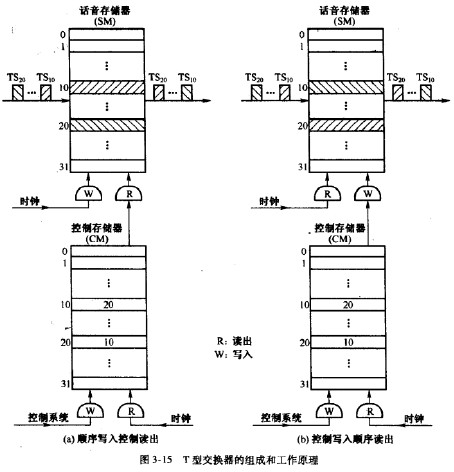 下面以兩個用戶之間要求通話為例,說明時間交換器的工作原理。假定用戶A占用了TS)0,用戶B占用了TSm,兩個用戶要實現通話,就必須把TS,。時隙中的內容交換到TSm,同時把TSm的內容交換到TS,。。經過分析,控制系統會在CM的10號單元寫人20:20號單元寫人10。在圖3-15(a)中,話音存儲器是順序寫入,輸人復用線上的各個時隙的內容順序寫人到SM的相應單元,如TSID的內容寫人到SM的10號單元,朽的內容寫人到SM的20號單元。話音存儲器由CM控制讀出,在TS,。時刻,CM輸出20,控制將SM的20號單元中的內容讀出,即輸出到了TSW,因而完成了從的交換。同理,在TSM時刻,CM輸出10,控制將SM的10號單元中的內容讀出,即輸出到了TS&則完成了從TS,。到交換。在圖3-15(b)中,話音存儲器是由CM控制寫人顯然在TS。時刻,CM輸出20,控制將TS。的內容寫人到了SM的20號單元,同理將朽^的內容寫人到了SM的10號單元。SM按順序讀出,10號單元的內容輸出到TS。但SM的10號單元寫人的是的內容,這樣就完成了從TSjTS,。的交換,同理可以完成從TS。到TSM的交換。