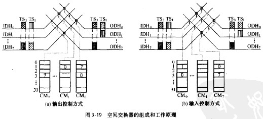 圖3-19中給出的是一個8x8交叉接點矩陣,它有8條輸人時分復(fù)用線IDH。IDH7,8條輸出時分復(fù)用線ODHfl~ODH7。控制存儲器(CMfl~CM7)的作用是對交叉接點進行控制。空間交換器的控制方式有兩種:輸出控制方式和輸人控制方式。在圖3-19(a)中,它是按輸出復(fù)用線來配置控制存儲器,稱為輸出控制方式。每一條輸出復(fù)用線的控制存儲器決定哪一條輸人復(fù)用線上的時隙要交換到這條輸出復(fù)用線上來。控制存儲器的單元數(shù)等于復(fù)用線卜.的時隙數(shù),甲元的位數(shù)由所控制的交叉接點數(shù)決定n控制存儲器由控制系統(tǒng)“控制寫人、順序讀出”,與對T型交換器的CM操作相同。因此可以說:在輸出控制方式中,控制存儲器號與出線號相對應(yīng),控制存儲器的單元號與時隙相對應(yīng),單元中的內(nèi)容與人線號相對應(yīng)。在圖3-19(b)中,它是按輸人復(fù)用線來配置控制存儲器,稱為輸人控制方式。每一條輸人復(fù)用線的控制存儲器決定將輸人復(fù)用線上的時隙要交換到哪一條輸出復(fù)用線上去。因此,在輸人控制方式中,控制存儲器號與人線號相對應(yīng),控制存儲器的單元號與時隙相對應(yīng),單元中的內(nèi)容與出線號相對應(yīng)。
