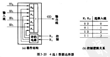 空間交換器的交叉接點矩陣,常見的有4x4,8x8,32x32等,其電路可用數(shù)據(jù)選擇器來實現(xiàn)。這里以4x4為例說明交叉接點矩陣電路的設(shè)計,可選用4選1數(shù)據(jù)選擇器來構(gòu)成4x4矩陣,圖3-20給出了數(shù)據(jù)選擇器的結(jié)構(gòu)和控制邏輯關(guān)系。