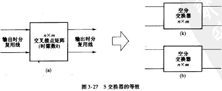 空間交換器S是按時分方式工作的,對于每一個時隙時間,S的交叉接點矩陣有一種連接狀態。給定s交換器如圖3-27(a)所示,假定交叉接點矩陣為/IXm,時分復用線的時隙數為it。則圖3-27(a)所示的S型交換器可等效為圖3-27(b)所示的A個nxm空分交換器。