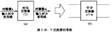 等效的空分網絡必須與原數字時分網絡的結構、性能一致。我們首先分析時間交換器和空間交換器的等效,進而討論多級網絡的等效和阻塞計算。圖3-26(a)所示是一個T型交換器,假設輸人時分復用線上有n個時隙,輸出時分復用線上有m個時隙,由于輸人時分復用線上的任一時隙可以交換到輸出時分復用線上的任一時隙,每一個時隙等效為模擬網絡中的一條線,則圖3-26(a)所示的T型交換器可等效為圖3-26(b)所示的nxm空分交換器。