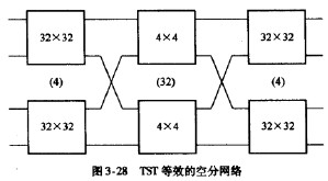 對于多級數字時分網絡,首先把網絡中的各級T或S交換器進行空分等效,然后根據各級之間的鏈路連接情況,用模擬線將各級連接起來。如圖3-22所示的TST網絡,第一級的四個T交換器等效成四個32x32空分交換器,第二級的S交換器等效成32個4x4空分交換器,第三級的四個T交換器同樣等效成四個32x32空分交換器。用級間連線把各級交換器連接起來,就得到圖3-28所示的等效空分交換網絡。