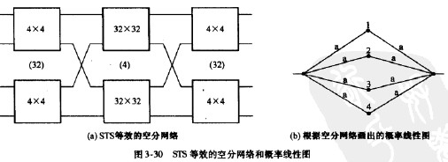 對于圖3-23所示的STS網絡,等效空分網絡和概率線性圖如圖3-30所示。其他形式的多級網絡,讀者可自行等效并進行阻塞計算。