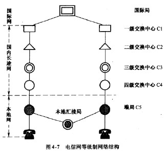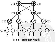 現行電信網為等級制樹狀網絡,整個通信網分為國內和國際兩部分。根據CC1TT(現ITU-T)的建議,用于國內通信的部分可包括4級~5級(小的或地區1級-2級),國際部分規定為三級。實際通信網的結構具有如圖4-7所示的形式,圖中自上而下可分為國際網、國內長途網和本地網。