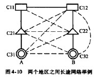 例[4-1]兩個地區之間的長途網絡結構如圖4-10所示,假定交換中心A呼叫交換中心B,試按由遠至近選擇順序依次給出全部路由。