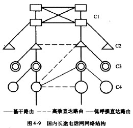 我國國內電話網自1986年以來,實現了五級的等級結構,由四級長途交換中心和第五級的端局組成。其中Cl~C4構成國內長途網,采用復合型網絡結構,圖4-9所示為國內長途電話網結構。一級交換中心C1為大區中心;二級交換中心C2為省中心;三級交換中心C3為地區中心;四級交換中心C4為縣中心。C1之間采用網狀網結構,其他各級逐級匯接。