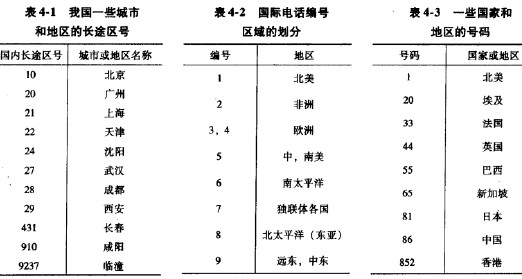 國內(nèi)長途區(qū)號是用于區(qū)別同一內(nèi)不同編號區(qū)域的號碼,我國采用不等長區(qū)號,區(qū)號位長為2位~4位。其中10為北京;IX(1=0-9)為特大城市或大區(qū)中心城市本地長途區(qū)號;XYZ(X=3-9,y為奇數(shù),Z=0~9)用于省會和省轄市;縣級長途區(qū)號為4位。表4-1所示為我國一些城市和地區(qū)的國內(nèi)長途區(qū)號。隨著C3本地網(wǎng)的建立,各縣的長途區(qū)號均與C3局一致,只有少數(shù)偏遠(yuǎn)地區(qū)尚未建立C3本地網(wǎng),仍保持4位長途區(qū)號。撥打國內(nèi)長途電話,首先撥國內(nèi)長途冠號“0”,然后撥國內(nèi)長途區(qū)號和本地號碼。
