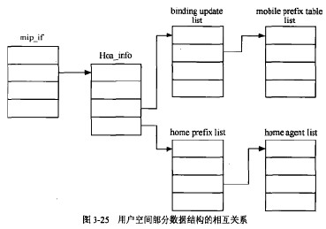 用戶空間數據結構包括HA列表、家鄉前綴列表、HoA信息表、BU列表、綁定緩存、移動IP接U倌息表、定時器等,此外還有關于安全方面的Nonces、Cookies,Tokens等。它們主要用于記錄各種數據的狀態,部分結構的相互關系如圖3-25所示。