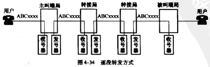 (2)逐段轉發方式:信令逐段進行接收和轉發,全部被叫號碼由每一個轉接局全部接收,轉接局根據被叫號碼確定傳輸路由,并依次逐段轉發下去,直至被叫端局,如圖4-34所示。逐段轉發方式的優點是在每一段鏈路上信令類型可以不一致,對鏈路質量要求低。但其缺點是轉接局信令設備略為復雜,信令的傳輸速度慢。