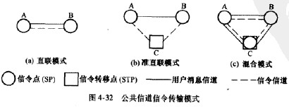 隨路信令系統中,信令與相關話路總是同路甚至同信道,因而信令與用戶消息的傳輸路由總是相同的。對于公共信道信令,信令信道與用戶消息信道并不存在一一對應的關系。圖32給出了公共信道信令的傳輸模式示意圖。在圖4-32(a)中,信令信道與用戶消息信道具有同一路由,在A,B之間的所有話路的信令都由與話路并行的公共信令信道傳輸,這種模式稱為直聯模式。一條64kbit/s信令信道大約可傳送2萬條話路的信令為每個中繼線群配備一條信令信道顯然是不經濟的。由于信令在傳輸過程中與用戶消息信道無關,它完全可過不同的路由來傳輸。在圖4-32(b)中,A,B之間的所有話路的信令都由另一路由傳輸,A點發出的信令需要經過C點轉發后,再傳輸到B點,這種模式稱為準直聯模式。收發及處理信令的點(如A,B)稱為信令點(SignalingPoint,SP)。轉發信令的點(如C)稱為信令轉移點(SignalingTransferPoint,STP)。信令點和信令轉移點常作為交換機控制系統的一個子系統位于交換機中。