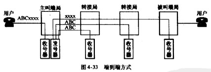 (1)端到端方式:主叫端局收到用戶所撥的完整號碼后,僅向中間轉接局發送選擇路由所需的長途區號,并完成到轉接局的接續,如圖4-33所示,圖中ABC表示長途區號。第一轉接局根據收到的長途區號,完成到下一轉接局的接續,然后由主叫端局直接向第二轉接局發送ABC。第二轉接局根據ABC找到被叫端局,完成到被叫端局的接續,此時主叫端局向被叫端局發送用戶號碼xxxx,建立起主叫端到被叫端的接續。端到端方式的優點是發碼速度快,撥號后等待時間短。缺點是要求全程采用同一信令系統,對鏈路質量要求高,在連接建立期間占用主叫端局的信令設備時間長。