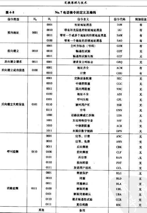 標題碼占8bit,它分為H。和&兩個域。H。用于區(qū)分信令類型,H,用于區(qū)分同類中的不同信令。No.7信令系統(tǒng)電話用戶部分所定義的信令及相應(yīng)的H。和H,的編碼如表4-8所示。當(dāng)一條信令的信息量較大,H,不足以表達時,信令標題之后可以增加若干個補充字節(jié)(附加信息)。