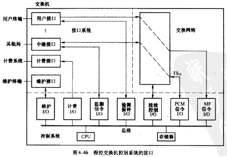 圖4-46給出了計算機控制系統的常見接口,這些接口連接的外設不同,輸人信號形式不同。隨著交換機接口種類的增加,控制系統的對應接口也會相應增加。可以看到,用戶接口提取的帶外信令被直接送人控制系統,帶內信令則通過交換網絡送人控制系統。帶外信令及振鈴控制均是0/1開關信號,僅需lbit表示,控制系統中的相應接口應能將來自多個用戶接口監測信令合并為適合總線傳輸的8位或16位并行數據。帶內信令當采用PCM編碼時,控制系統的PCM信令I/O必須具有適當的傳輸速率,如當PCM信令為TS,6單路信令時,I/O應工作于64kbit/s速率。此外,I/O應能將來.自交換網絡的串行數據轉換為適合總線傳輸的并行數據。當帶內信令采用MF編碼時,控制系統的MFI/0應能將相應的DTMF信號或MFC信號轉換成若干位(通常是4位)的二進制碼字,并行輸出。接續控制1/0提供交換機