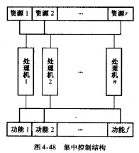 如果在圖4-48所示的系統中,每一臺處理機只能達到部分資源,只能執行部分功能,則稱為分散控制。分散控制又稱為功能分擔。分散控制的優點是邏輯淸楚,各處理機的操作系統較簡單,且可以根據不同的功能需要逸用不同的處理機。它的缺點是任一CPU發生故障都會引起系統局部或全部癱瘓,此外需要附加的機間通信接口和相應的處理軟件。
